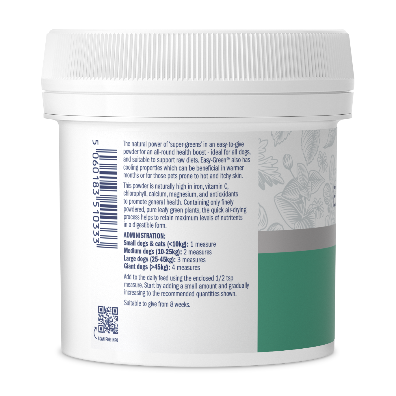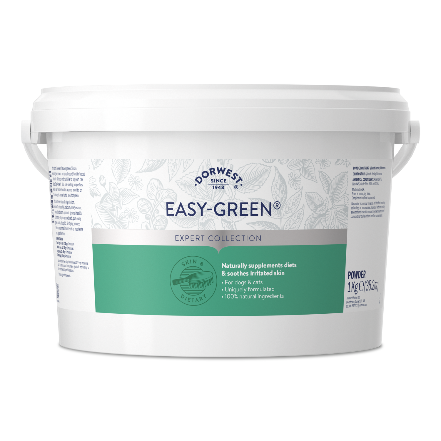 The quick air-drying process retains maximum nutrients in a digestible form to naturally boost levels of iron, vitamin C, chlorophyll, calcium, magnesium, and antioxidants (to neutralise free radicals) for all-round health. For pets with hot, itchy skin, our Easy-Green® Powder also has cooling properties.
