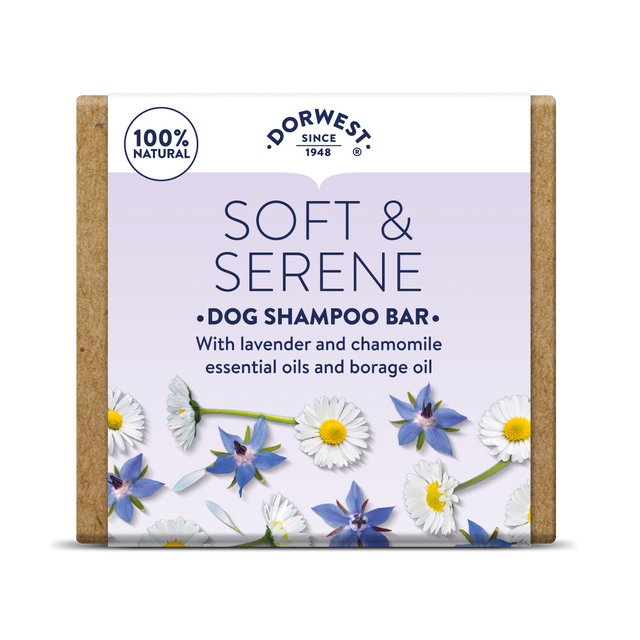 Our Soft & Serene Dog Shampoo Bar is specially formulated for dogs prone to itchy, irritated and sensitive skin. With borage oil and chamomile and lavender essential oils, alongside a base blend of shea butter and coconut, sunflower, castor and sweet almond oils, these highly nourishing and soothing natural ingredients support optimal skin health, so your dog can wave goodbye to flaky, dry skin.