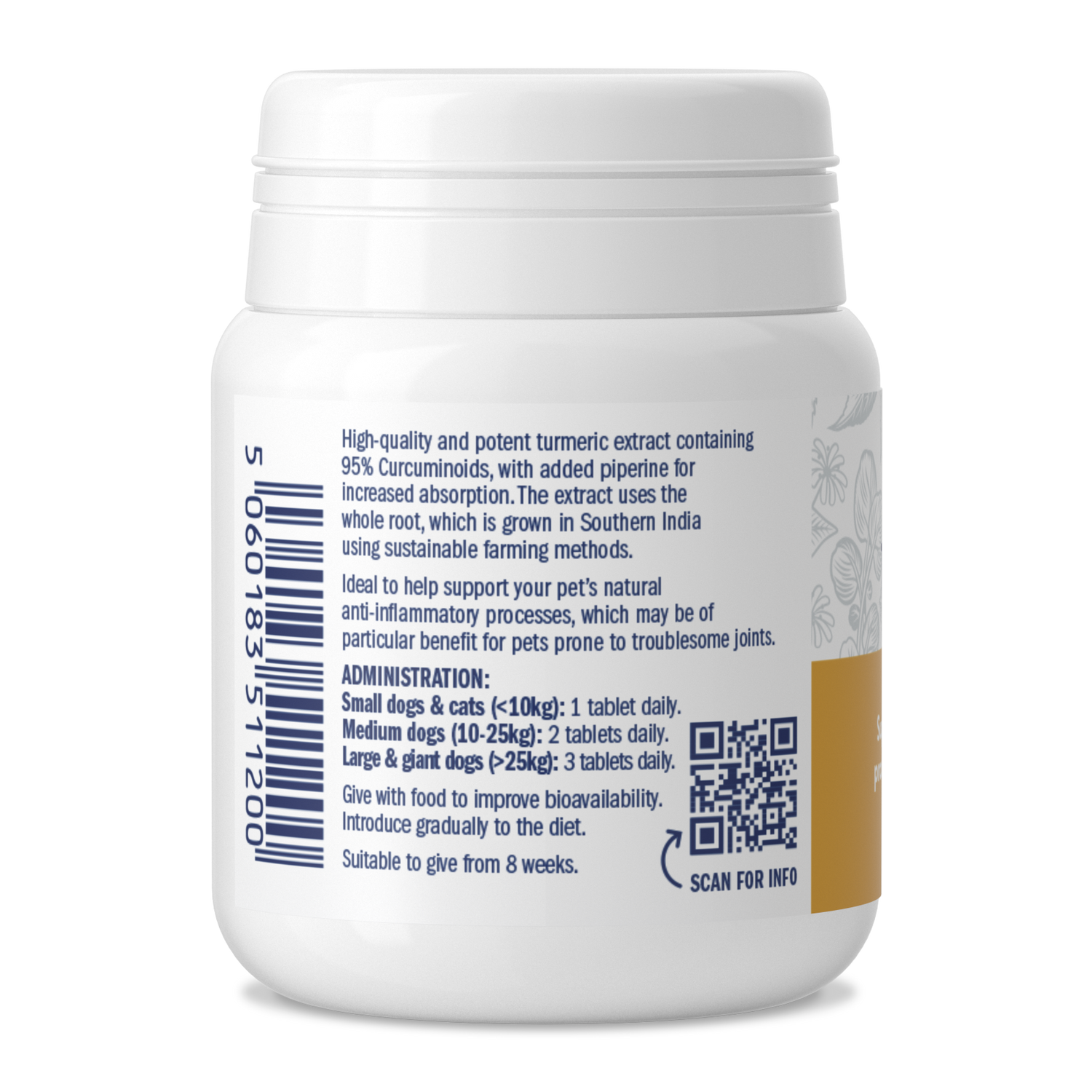 Our specially formulated Turmeric Tablets for dogs and cats are made using a pure and potent extract. Consisting of 95% curcuminoids - the active part of turmeric - they can help support your pet's natural anti-inflammatory processes.
