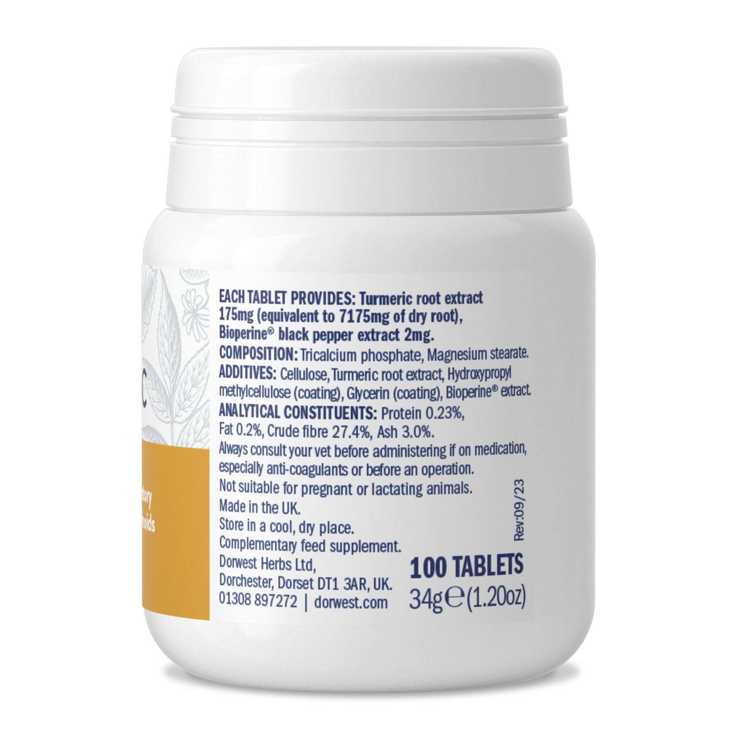 With the popularity of turmeric soaring there are unfortunately those wanting to make a ‘quick buck’ by selling low-quality produce. Turmeric has even been found to be mixed with other ingredients and artificially coloured. Good quality turmeric and curcumin supplements for dogs and cats will contain a standardised amount of curcuminoids of 95%. Our Turmeric Tablets were made with this in mind and contain 95% curcuminoids, with each tablet providing 175mg of whole root turmeric extract, equivalent to 7175mg dry whole root.